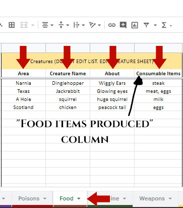 [sub-sheetname you want to copy FROM]: For the food from plants, we want to copy from the plants sub-sheet. For the food from creatures, we want to copy from the creatures sub-sheet. So, for this example, it will either be Plants or Creatures.
