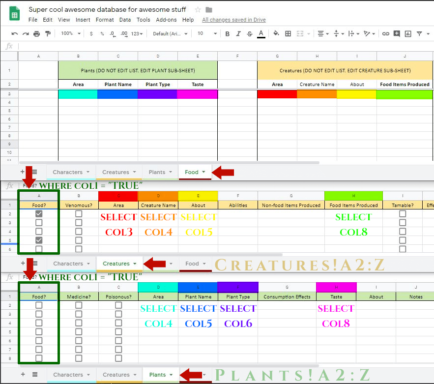 Since Row 2, 5, and 7 in the Creatues sub-sheet have checked boxes, Drive will know that we want to copy Column D from those rows and paste them into the cell where our function is on the Food sub-sheet.