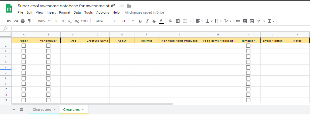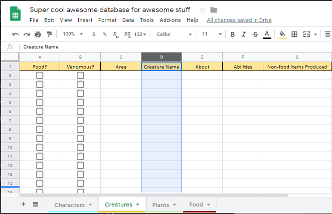 For the creatures sub-sheet, I add “food” and “venomous” columns. This will come in handy soon.