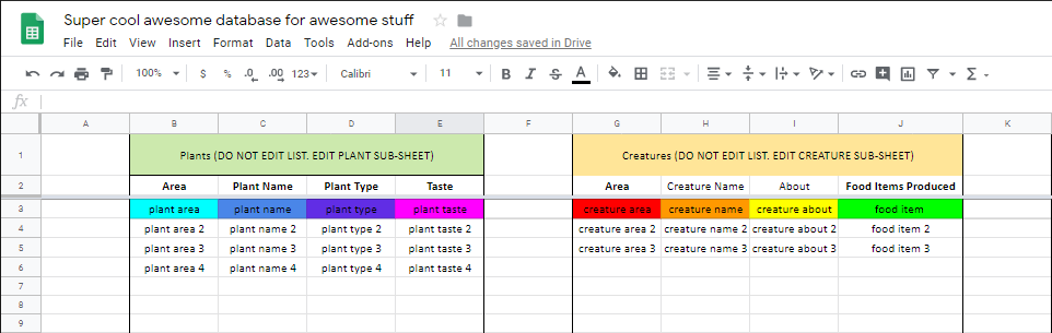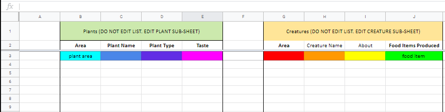 When you start filling out your creature and plant sub-sheets with information, you could end up with dozens of food items in plants. Because of this, we want to make sure that EVERYTHING below the function cells is left BLANK. It will break the function if a cell is not empty below it.