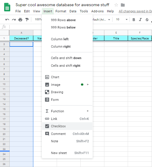 Since I love checkboxes, I use them a lot. To add them, highlight a cell or cells, go to the Insert tab, and click “checkbox.” For this sheet, I selected the first column (clicked “A” at the top of the sheet), ctrl+clicked the row 1 cell to deselect it (I don’t want a checkbox in the title cell), and then added the checkboxes.