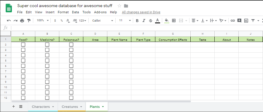 I add another sub-sheet called “plants,” and give it a few checkbox columns as well: food, medicine, and poisonous.
