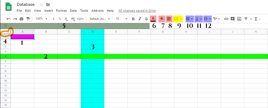 - Row – Click on a number on the left hand side to edit the whole row. You can resize a height of a row by clicking and dragging the top and bottom borders of the numbered cells on the left of the sheet.